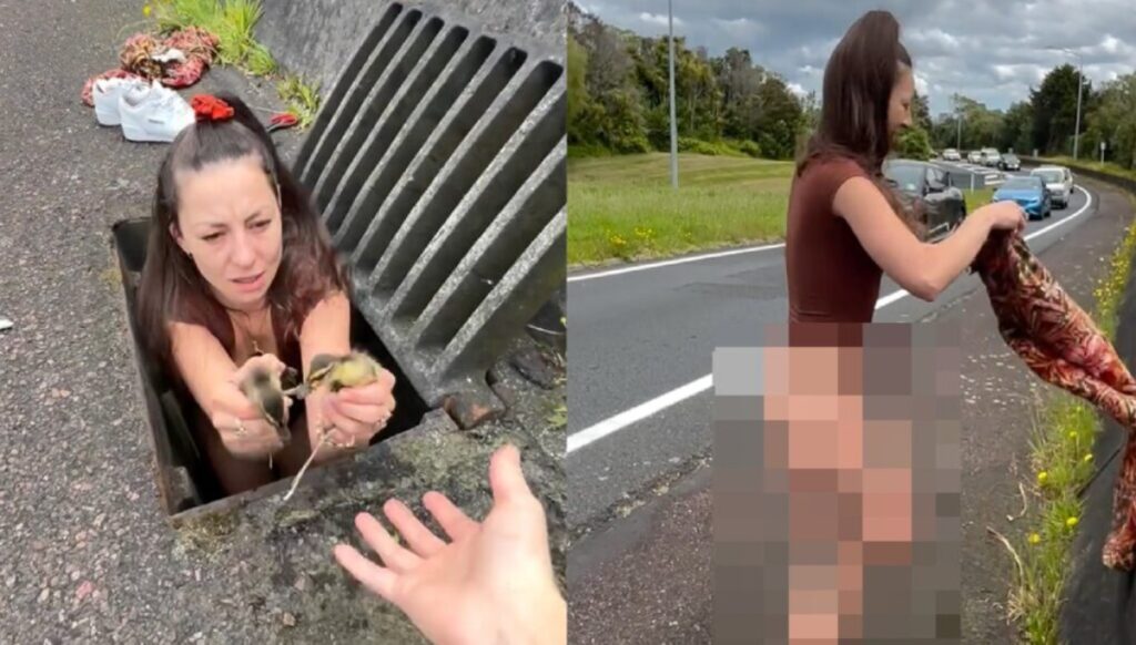 Toen ze doorhad dat er kuikentjes vastzaten in het riool, nam ze een opvallend besluit: ze trok haar broek uit en kroop het riool in om de beestjes te redden.