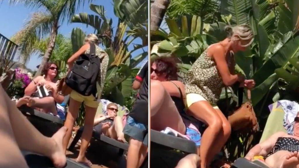 In de beelden is te zien hoe een vrouw bij het zwembad een ligbed betrekt dat al bezet lijkt door een handdoek. Zonder twijfel haalt ze de handdoek weg, legt haar eigen spullen neer en gaat liggen.