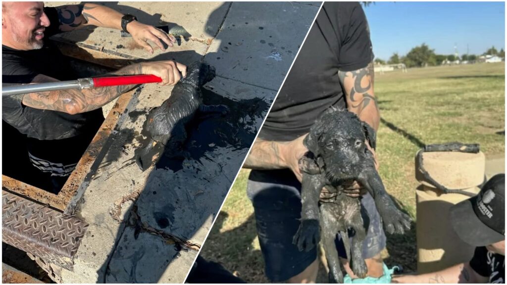 De politie kreeg een oproep van bezorgde voorbijgangers die het gehuil van een hondje hoorden. Toen agenten ter plaatse kwamen, ontdekten ze de puppy – vastgeklemd tussen modder en afval in een smalle buis.