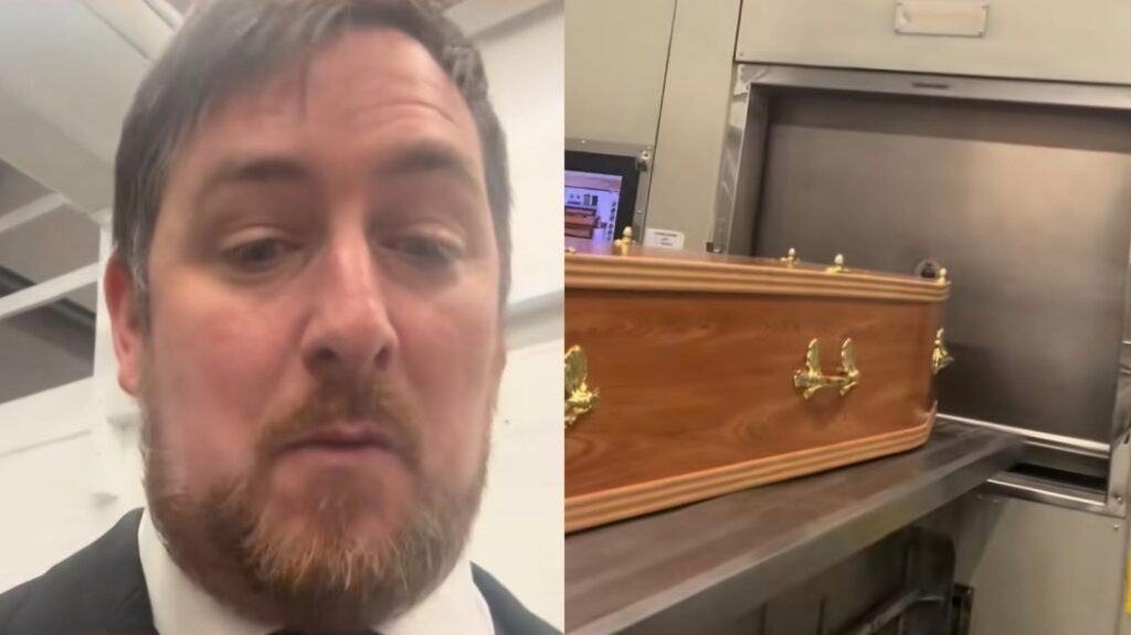 “Dit is wat nabestaanden niet zien,” zegt Savage. In de video toont hij hoe een kist, mét de overledene erin, volledig in de crematieoven wordt geschoven.